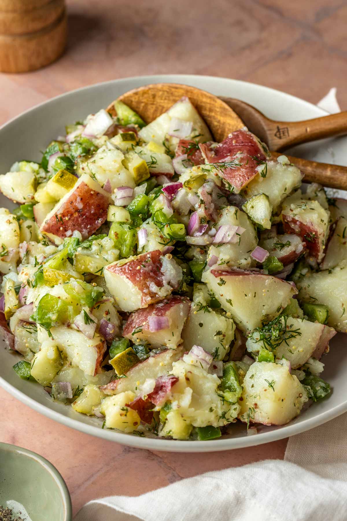 Remember to sprinkle 3 tablespoons of white vinegar on the potatoes when they are sitting in the strainer. This gives them a head start in absorbing that acidic flavor before they get tossed in the dressing. You can also use pickle brine in place of vinegar for this, but I find that vinegar gives it the best taste.